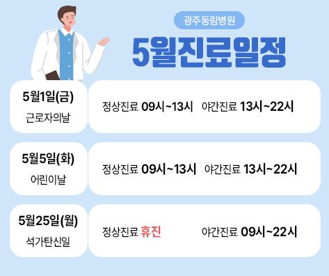 5월진료일정 게시글 작성정보 작성자 광주동림병원 작성일 26-04-02 14:35 조회수 28 댓글수 0 목록 게시글 본문 진료 일정 확인하시어 병원 내원에 착오 없으시길 바랍니다. 첨부파일 1개 5월진료일정.JPG (29.8K) 1회 다운로드 첨부일시 : 2026-04-02 14:36:06 다음글 3월 진료일정 26-02-25 댓글 0 등록된 댓글이 없습니다. 목록